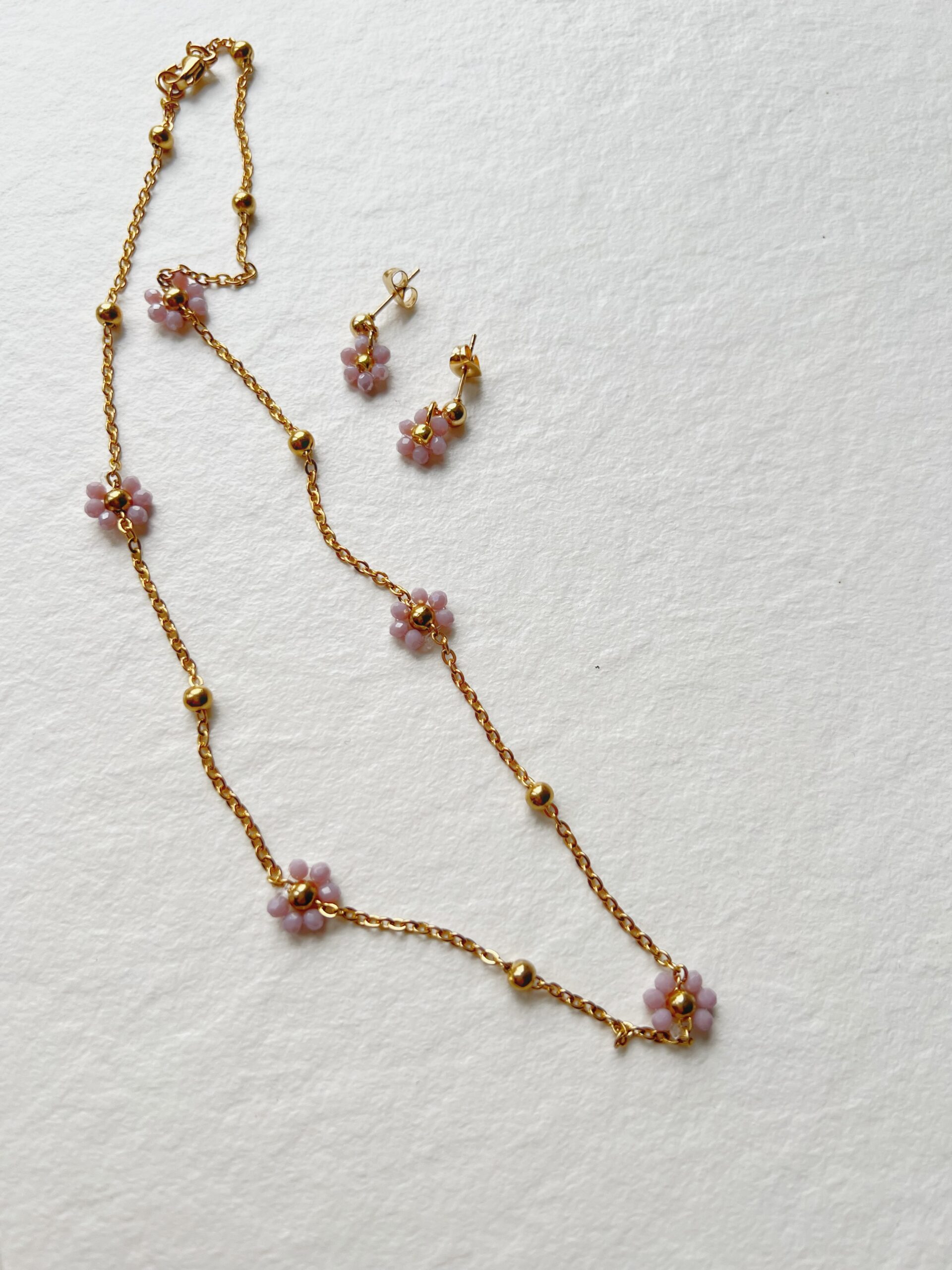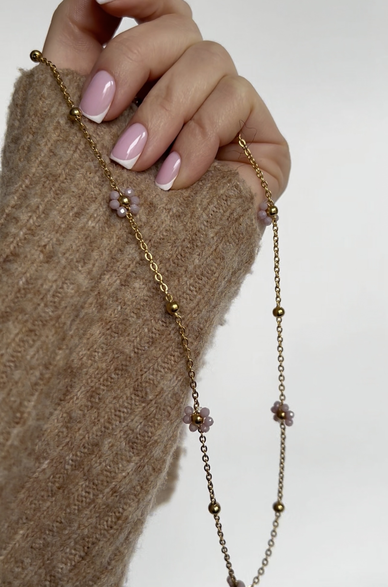 Delikatny, kobiecy łańcuszek ozdobiony drobnymi kuleczkami oraz stokrotkami z lśniących liliowych kryształków. Subtelnie odbija światło, dodając blasku każdej stylizacji – idealny na co dzień i na wyjątkowe okazje.